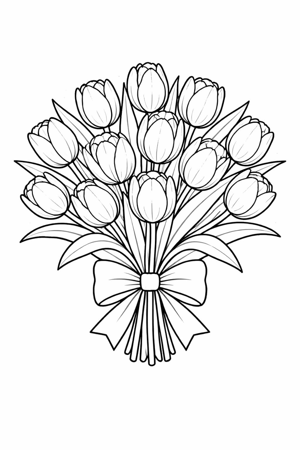 Bouquet coloring pages illustrate arrangements of flowers grouped together in decorative compositions. These designs may include wrapped bouquets, tied stems, vases, or loose floral clusters.