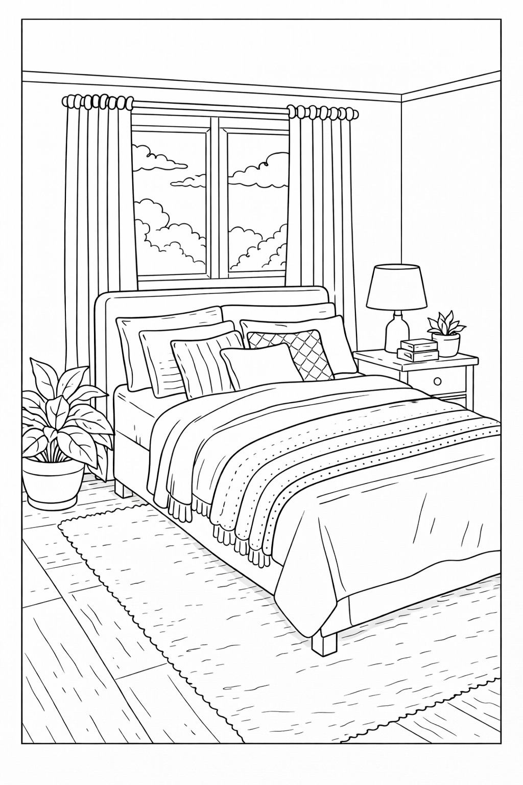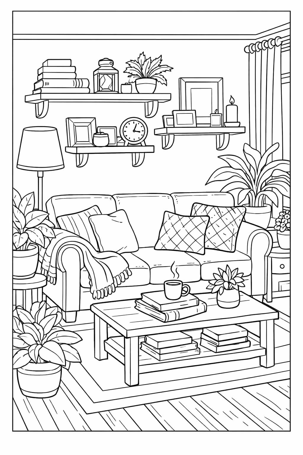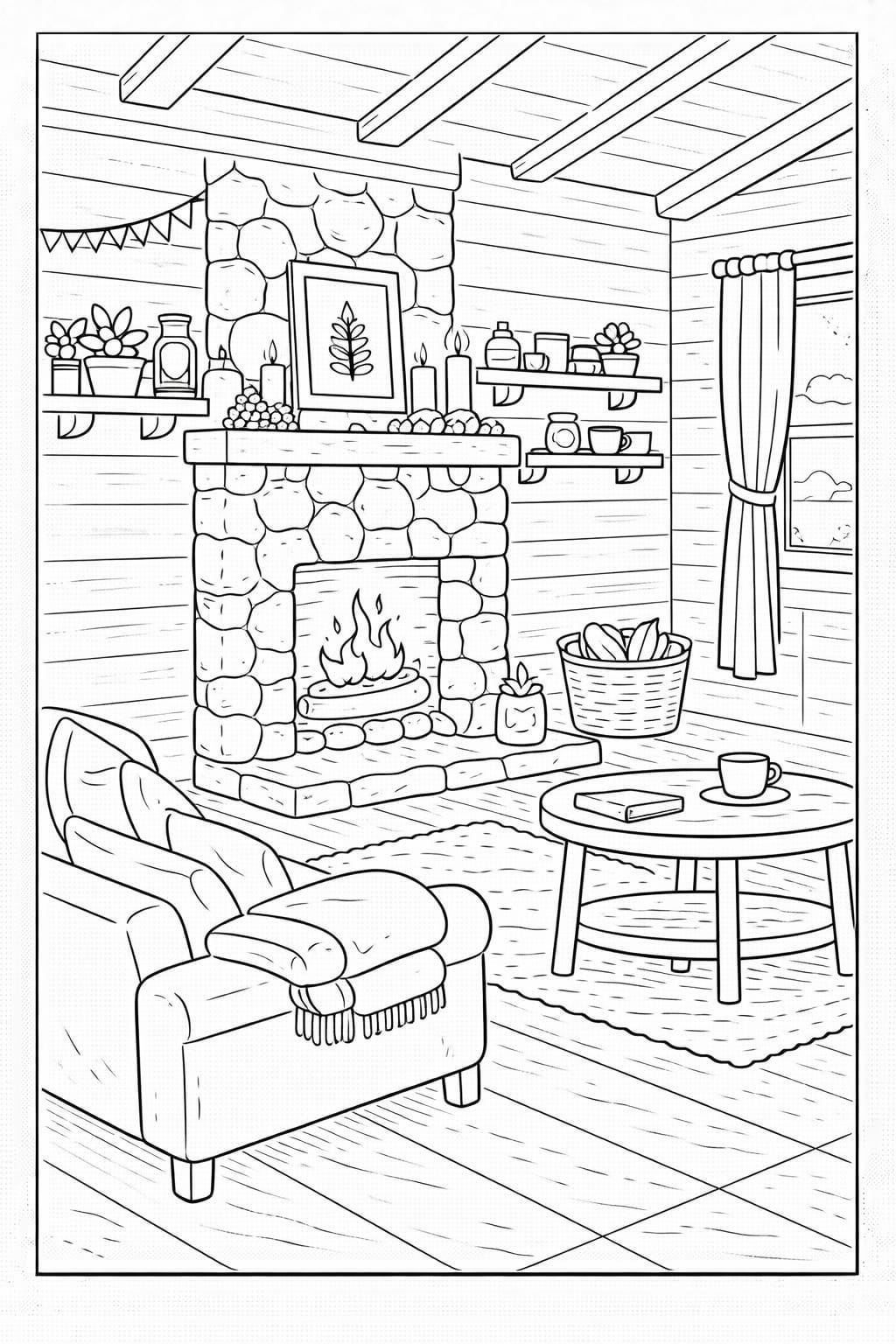 Cozy coloring pages are illustrations centered around warm, comfortable spaces and everyday scenes that evoke a sense of calm. Instead of dramatic landscapes or highly complex subjects, cozy designs focus on interiors, quiet moments, and lived-in environments.