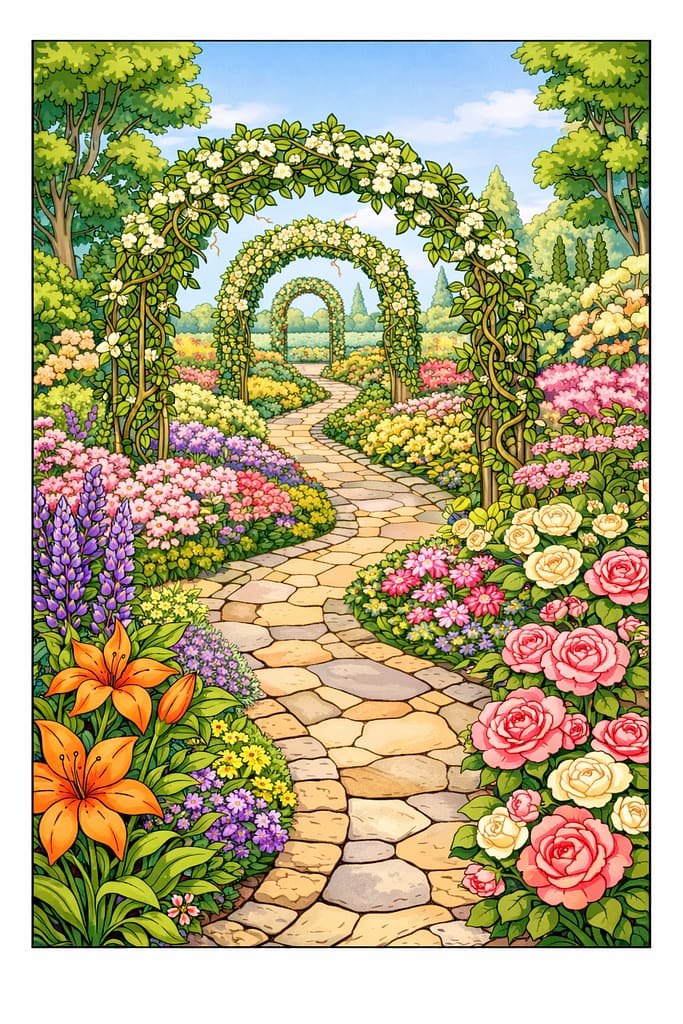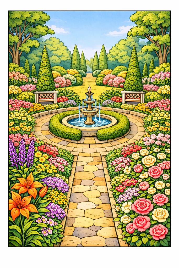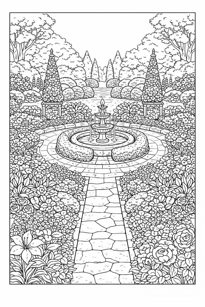 Garden coloring pages depict outdoor spaces filled with plants, flowers, trees, and decorative elements such as benches, fountains, and pathways. Unlike simple floral designs, garden scenes often combine multiple natural elements into harmonious compositions.