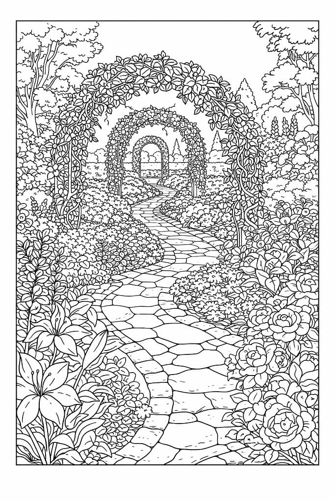 These garden illustrations are perfect for adults and older teens who enjoy detailed natural designs, as well as for anyone looking to unwind through mindful coloring. From elegant botanical gardens to cozy backyard scenes, each page invites you to slow down, focus, and enjoy the calming rhythm of coloring.
